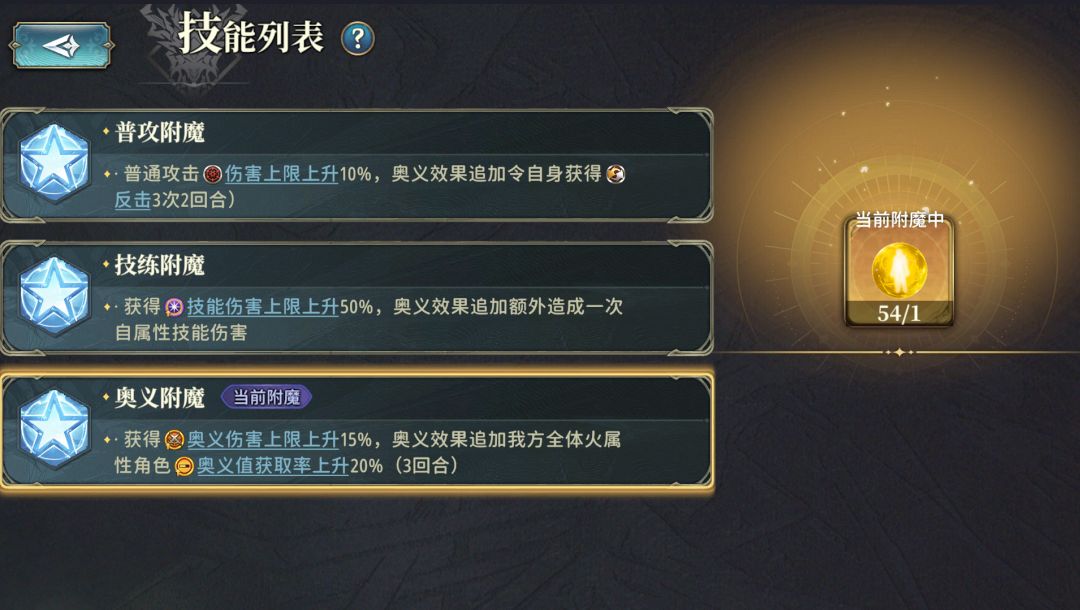 [魔武]的特点2是:可以通过附魔选择一种强力的特殊效果,这里的Buff增益是全队生效的,且放在[副手武器]也会生效,但是这个[奥义效果追加XX]只对主角生效,且只有[魔武]放在[主手武器]上时才会生效,不知道选什么就选[技练附魔]或者[奥义附魔](这个可以改,更改的材料不会缺)