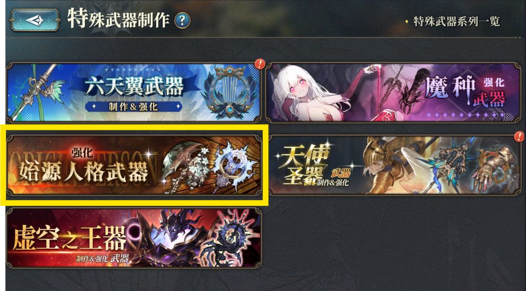 最后是[强化始源人格武器]系列,每个[属性]都有一把对应的武器,我们统称为[天人武]