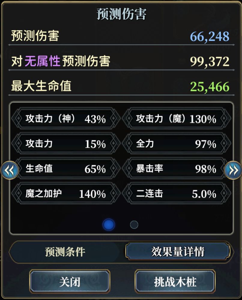 但这既没有考虑上文中讲的:不同类型的[攻击力](如:[攻击力(神)]、[攻击力(魔)]是不同的[攻击力]乘区,[武器盘]中的乘区越多,最终的[攻击力]收益就越高,也没有考虑:[奥义伤害上限上升]只有在你的[奥义伤害]达到[奥义伤害上限]时才有效果,假如你最高只能打出100万的伤害,连基本的[奥义伤害上限]168万都没有达到,那么去增加[奥义伤害上限上升]Buff就完全没有意义