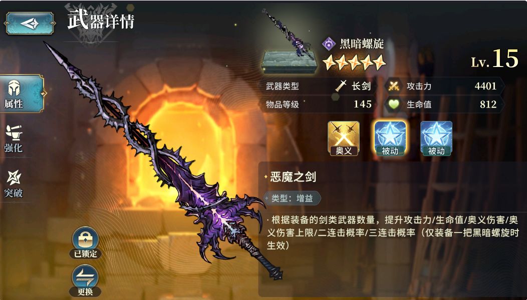 然后是[武器的突破],这个比较麻烦,和[魔物伙伴的突破]一样,4把同样的武器(包含本体)可以通过突破获得1把4星的武器,5星的突破则比较麻烦,同样是需要[火灵石板],[火灵石板]的获取方法在11.1 [苏尔特尔]的突破中有介绍