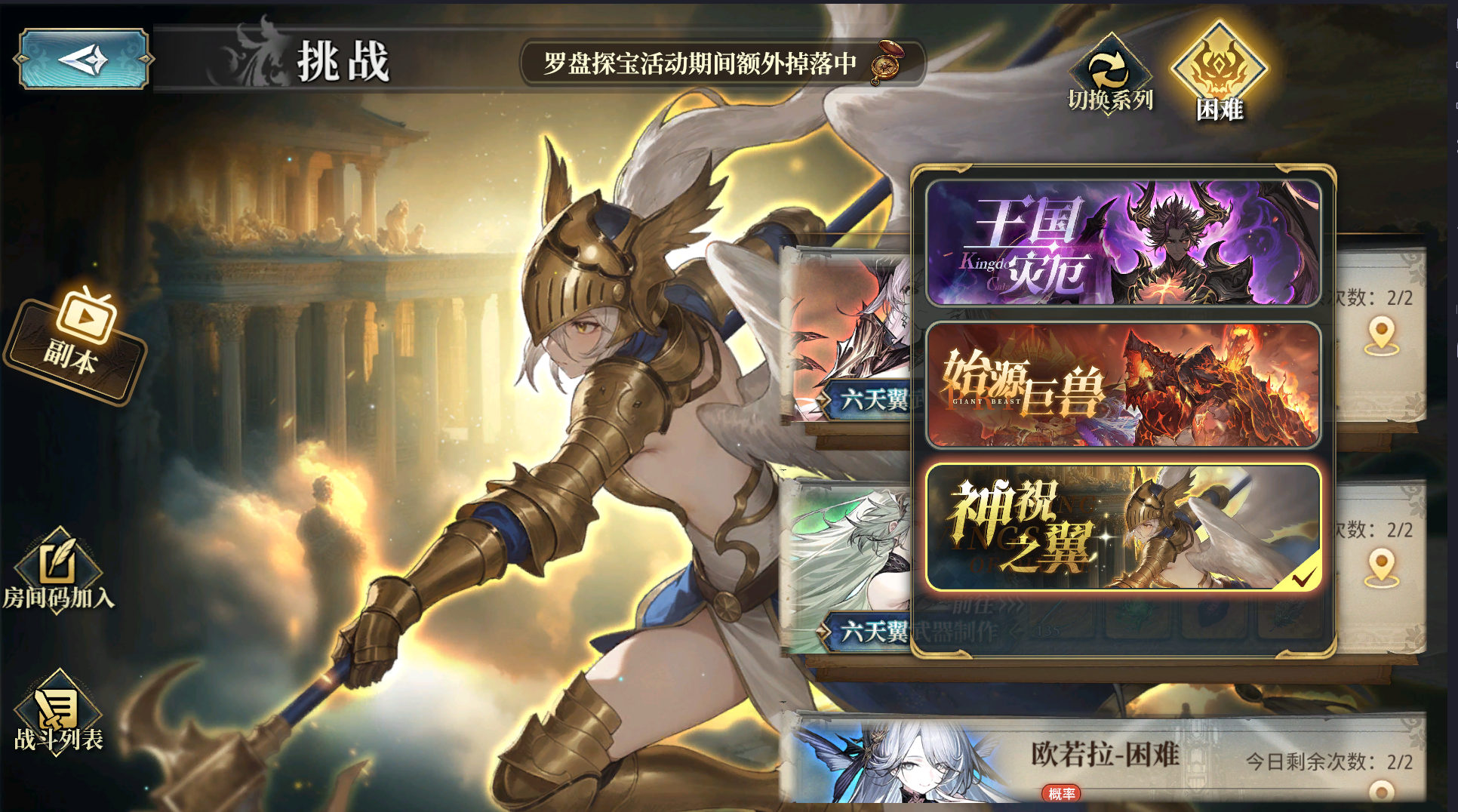 制作[神武]的特殊材料来源是:[神祝之翼]系列副本,这个系列的副本难度其实和[始源巨兽]一样,不过这个系列的4种[属性]的副本的存在意义,就只有刷我们制作特殊武器的材料而已,重要性不如我们的[始源巨兽]系列副本