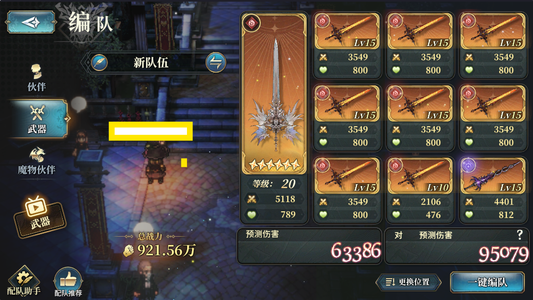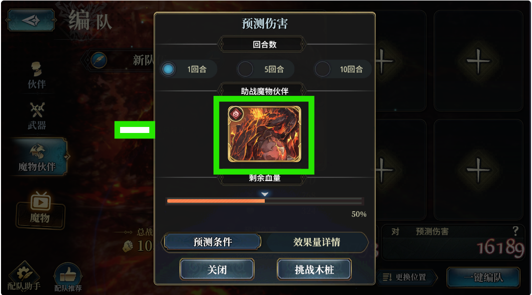 现在我们来学习[魔物伙伴]的进阶知识,之前在[武器数值详情]中,这个页面前文中没有介绍,这里表示的就是:我们在进入战斗前,可以选择的[助战魔物],点击下图标示的图案,我们可以选择3种最常见、实用的[魔物伙伴],这可以作为我们在[武器数值详情]中计算数据时所采用的[助战魔物]——我们在战斗前选择的[助战魔物]的[主位被动]同样对我们的队伍生效(我们这里选的[助战魔物]只是方便我们查看[武器数值详情]时的详细数据计算,其它时候没有作用,你在进入战斗后的[助战魔物]是什么要看你在进入战斗前的选择)