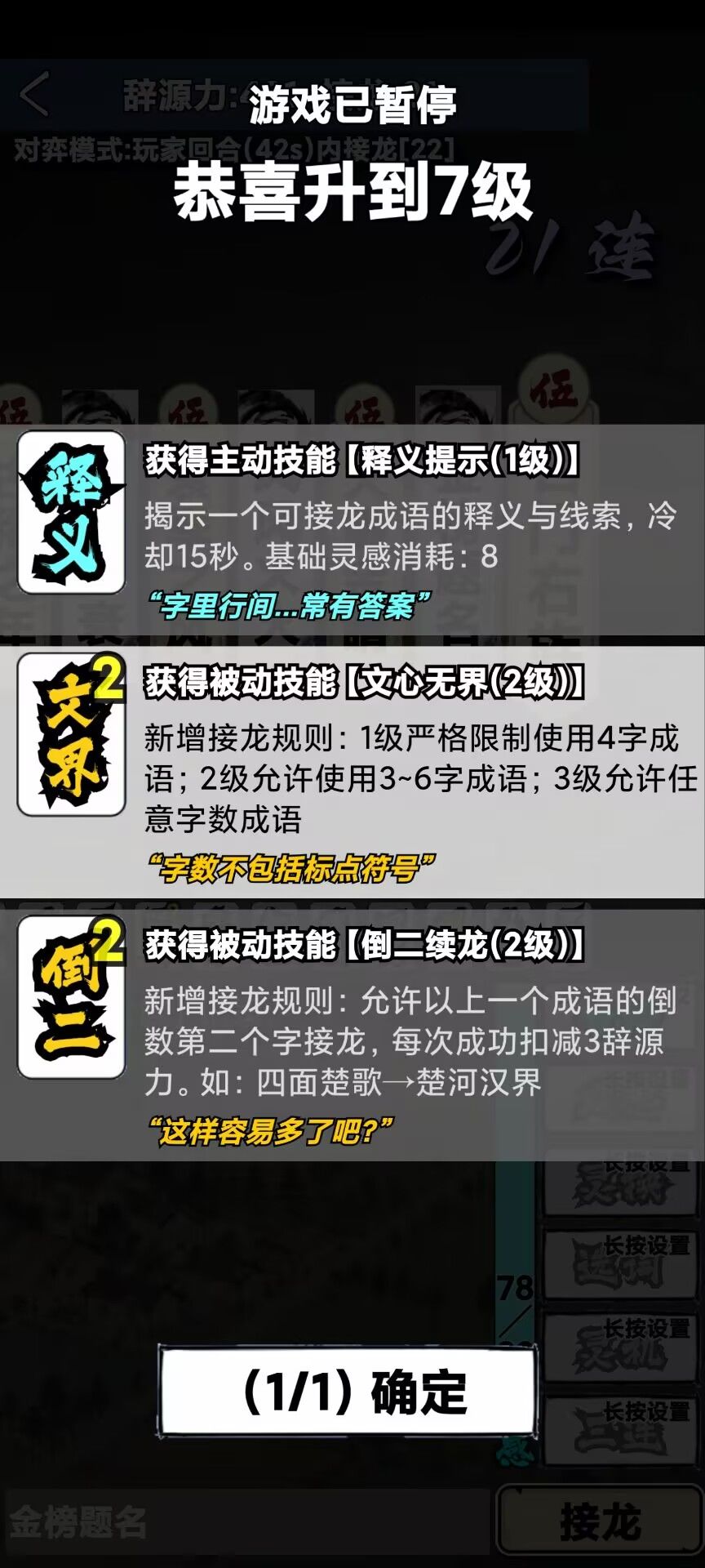根据部分玩家反馈,希望自己接龙只玩4字限定的成语,因此本次更新新增了一个影响全局的规则类技能,它将动态调整对局中可使用的成语字数范围——该技能玩家可以自由选择,升级后可扩展使用范围,也可以不升级,限定4字成语: