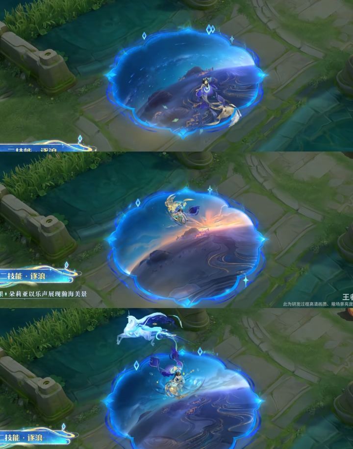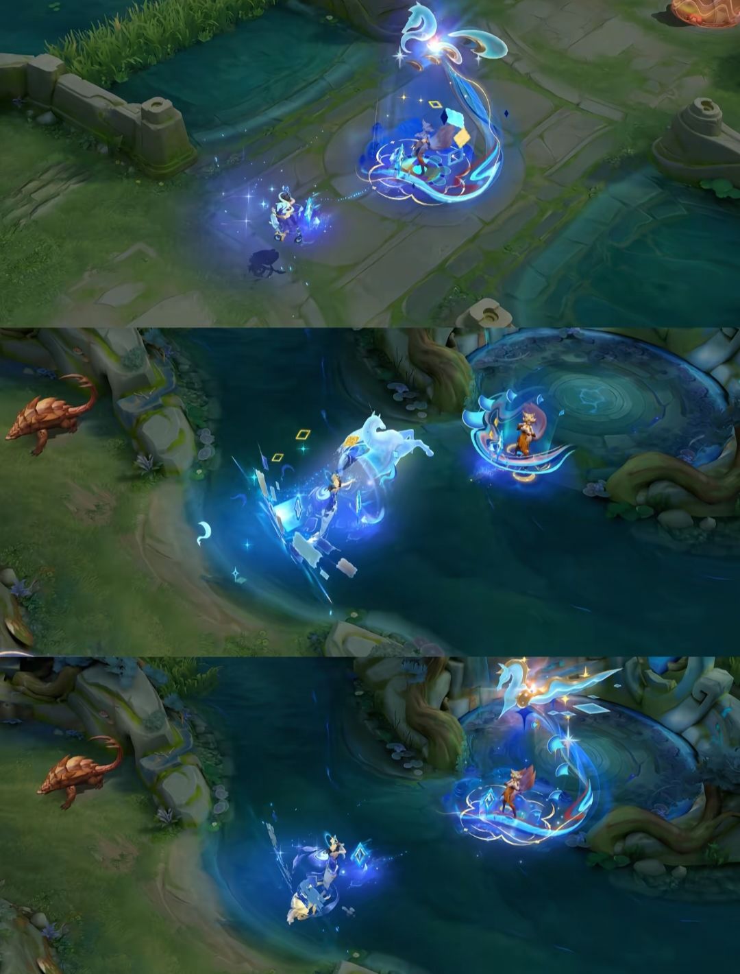 据悉,在这款皮肤背景故事中朵莉亚化身为乐声造景的神骥仙使,皮肤设计融合了龟兹壁画艺术与丝绸之路文化元素,技能特效展现出水陆双形态的不同视觉表现效果,大招还可以根据队友不同皮肤来触发多种神骥特效,其技能特效设计的核心元素是代表万千行路之人牵念的思绪星沙和龟兹菱格壁画