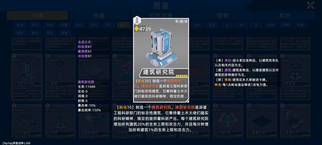 (PS:右上角为研发倒计时,倒计时结束会自动增加属性加成。点击可查看当前建筑研究院提供的建筑生命上限和攻击力加成比率。该比率不包含科技及神器的加成哦!)