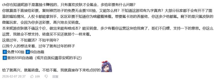 当然这次新春爆料,由于官方福利安排存在一些问题,也引起了不少玩家的不满,估计这次抽完皇冠后,又会有不少玩家会被气到退坑吧