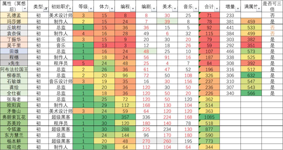 - 编剧:如果培养,龚绘或全仕崔都可以2转到制作人5可以360编剧,3转到硬工1可以400编剧,如果不用研究数据则外包最优即可