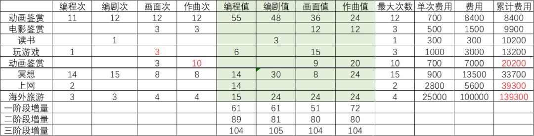 所有人培训都一样,如下是建议培训顺序,从上往下即可,其中玩游戏,动画鉴赏一阶段按需升级,二阶段以后玩游戏 2 次,第二次动画鉴赏 3 次即可(冥想可以补回来)