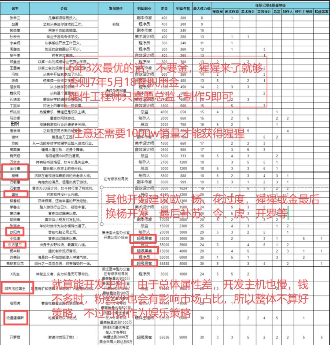 - 不缺钱前期建议:弗朗索瓦花(最强属性),苏美玲(最贵美术),东方蕙兰(比花略强音乐),令狐澈(初始黑客),杨本耕(高属性,低体力,低编程),欧阳宾(3转到硬工,属性也不错),喵司虎(体力条长),张海老或者矛盾山(美术3获得美少女),如果想早点主机也可以龚绘+全仕崔+国王换苏美玲、喵司虎和张海老