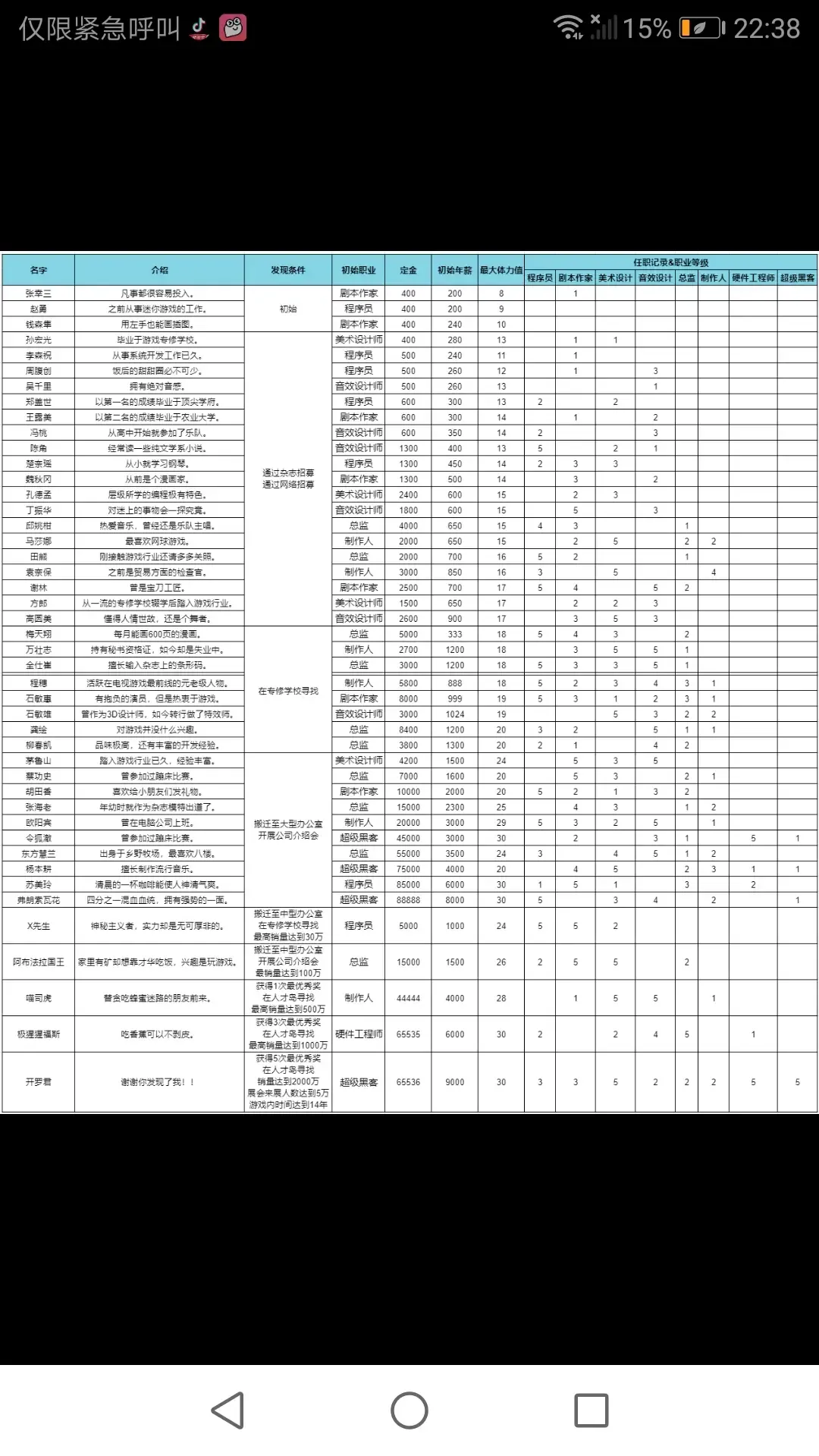 - 外包:期待度和知名度没有作用,不用管,只需要对比能力和钱,4 人自己培养属性高于外包, 6 人不升级外包属性较高,8 人看情况