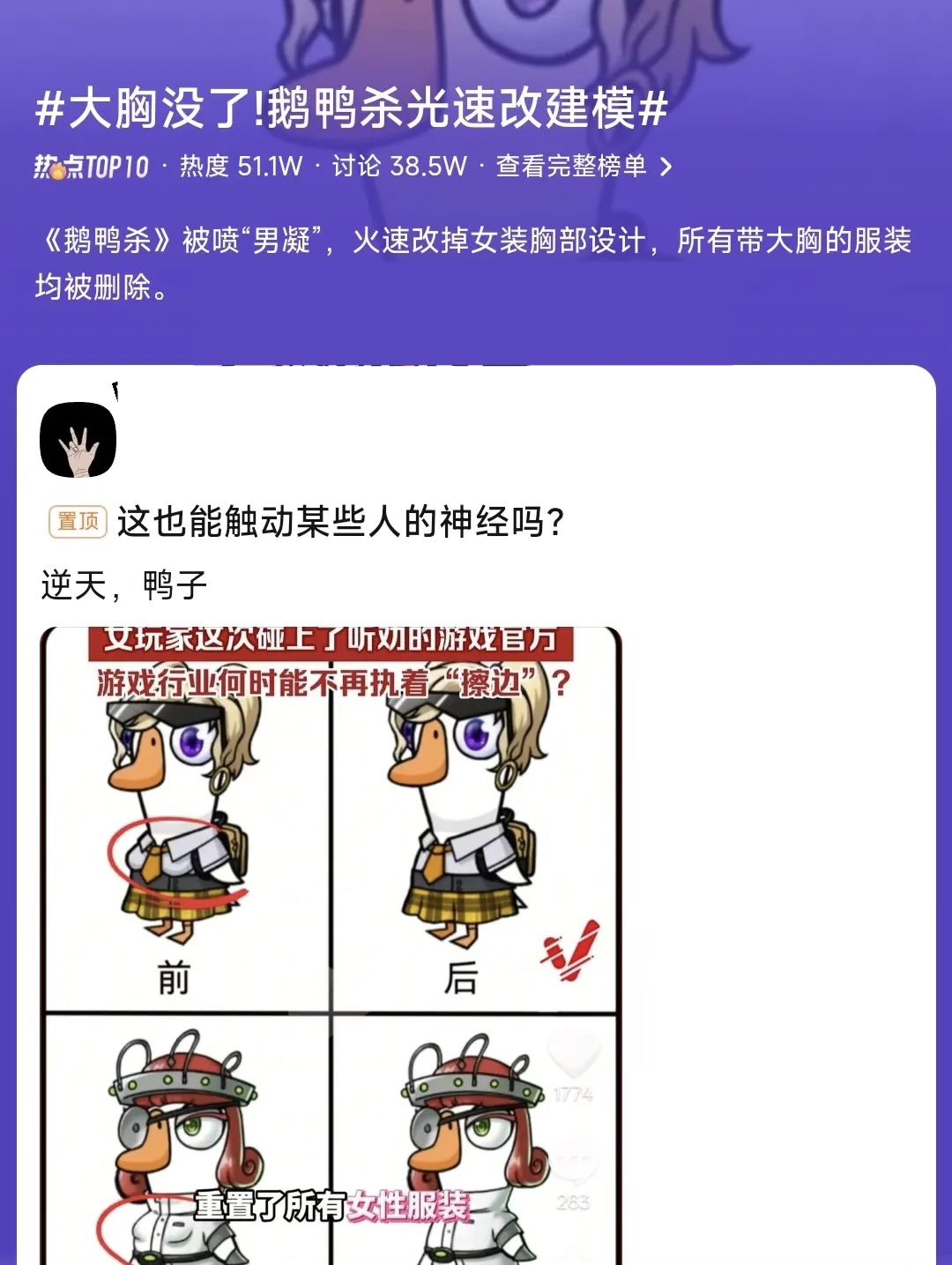 此次争议并非个例,近年来游戏行业多次出现女性角色设计被质疑“男性凝视”“过度擦边”的事件,核心矛盾集中在:角色外观是否服务于人设与世界观,而非单纯迎合猎奇审美;是否尊重女性玩家的视觉感受与身份认同;是否跳出“女性角色必须靠性感化博取关注”的陈旧创作惯性。业内观点认为,《鹅鸭杀》的快速调整,体现出当下游戏厂商对社区反馈的重视,以及对平等、包容、无凝视的创作导向的逐步回归。