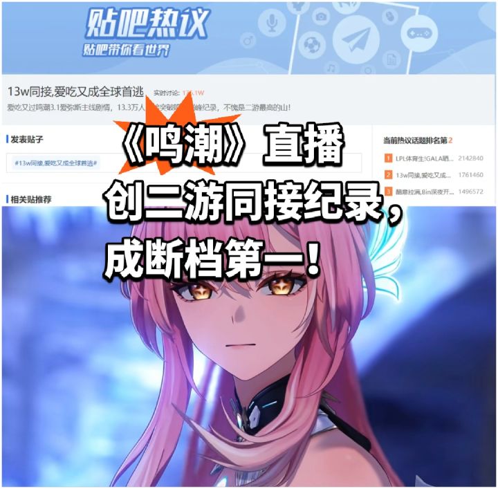 2月7日,主播“爱吃又”在某站直播《鸣潮》3.1版本爱弥斯主线剧情时,创下峰值超13.3万“同接”(同时在线观看人数)的纪录。2月8日,这一数据使其相关话题迅速登上贴吧热搜第二,在二次元游戏直播领域引发了广泛关注。有网友如此评价:“爱吃又直播鸣潮的同接数,已是二游断档第一,全站除去比赛直播外游戏最高一档,只有24年全网爆炸热度的黑神话首播比得上”。