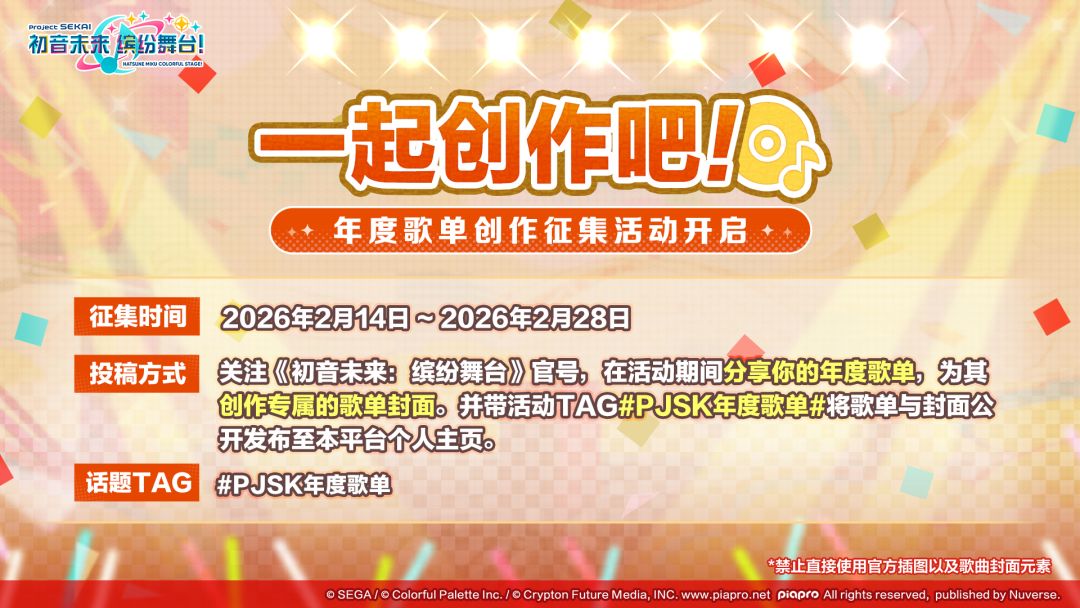 关注《初音未来:缤纷舞台》论坛,在活动期间完成你的创作作品,并带活动TAG#PJSK年度歌单 将歌单与封面作品公开发布至平台个人主页,即视为参与活动成功!