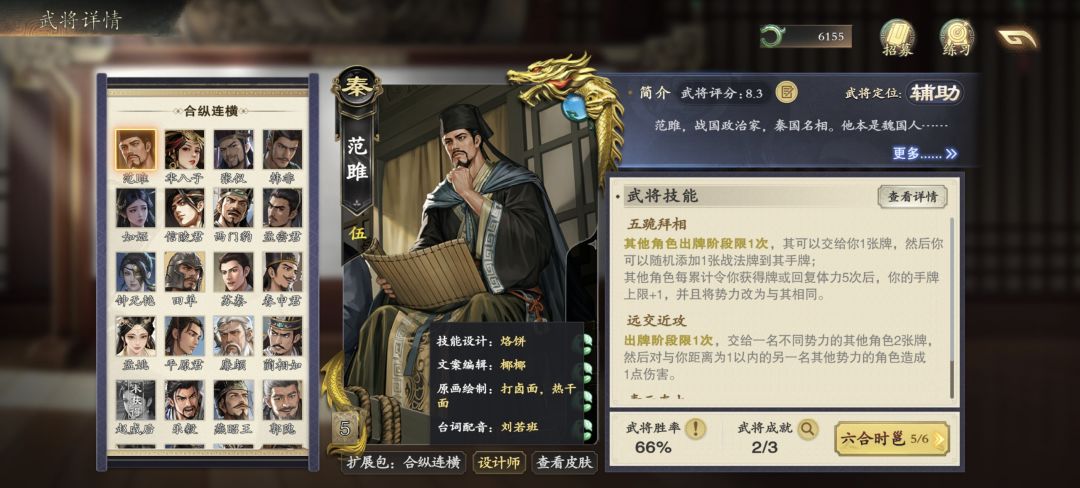 范雎的设计可以说初现饼味,一二技能迷之互斥不知所云,回复体力这个意象不知所云,手牌上限+1这个意象也不知所云,这些迷之小尾巴就是饼味的体现,青云直上也解释的很抽象,我在之前的帖子已经吐槽过了,就不说了,如果抛开饼味不谈就是一个比上不足,比下有余的中庸产品,你说他像廉颇那样完全ooc了吗?也没有,他的画面感你是能想象到的,尤其是远交近攻,你换我来设计远交近攻这个技能大概也是这样,但就是觉得跟好设计相比差点意思,属于食之无肉,弃之有味的那种。