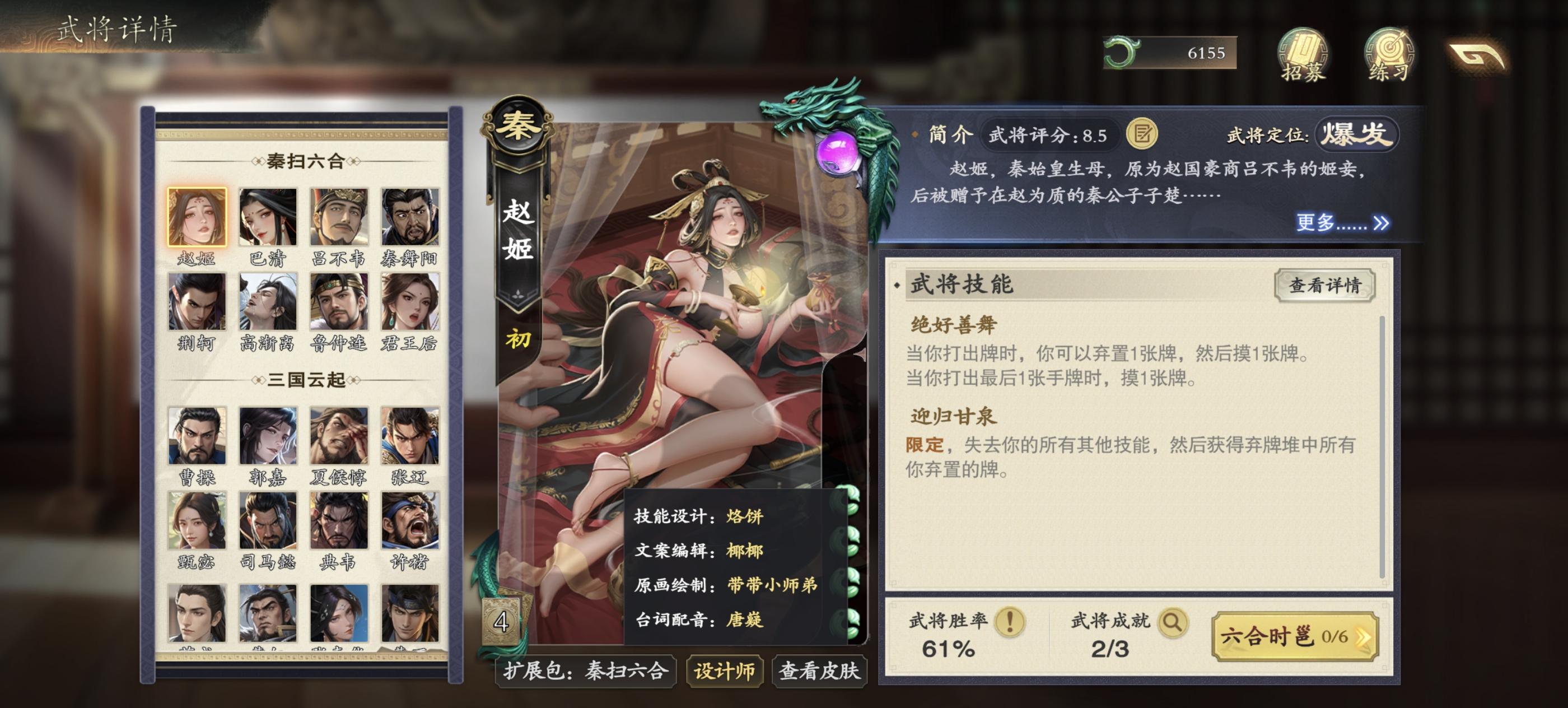 这位也是重量级,三国杀王基加陆逊的结合体,我也不知道用牌弃摸跟赵姬有什么关系。这种技能组你套谁身上都都能圆回来,比如我把这技能给孙权陆逊刘邦项羽,是不是一点都不违和?