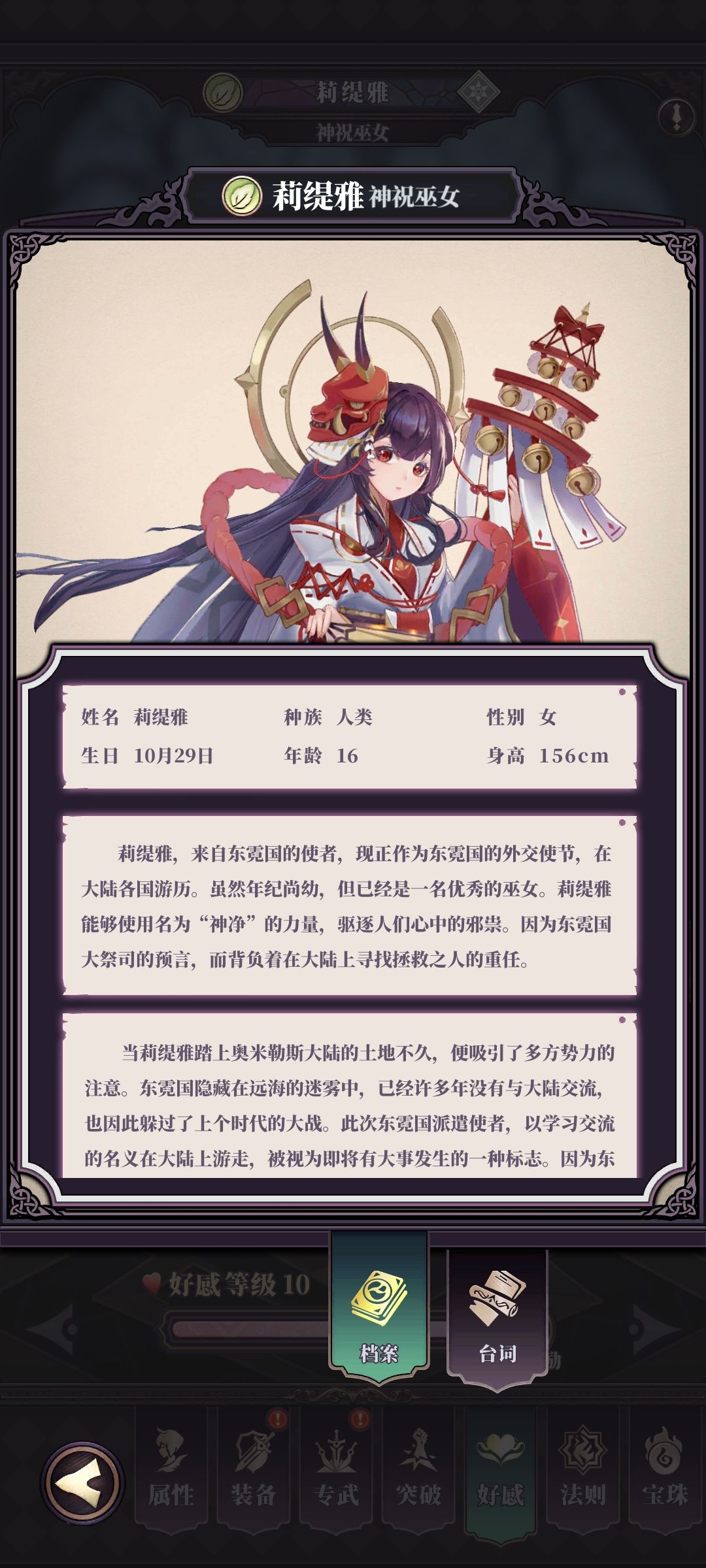 背景简介:来自东霓国的优秀巫女,作为外交使节在大陆各国游历。能够使用名为“神净”的力量驱逐人心邪祟。因大祭司的预言,背负着寻找拯救之人的重任。东霓国多年未与大陆交流,此次派遣使者被视为大事发生的标志。