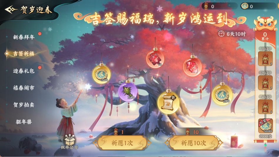 禧春闹市上架了非常多限购商品,而迎春礼包可获取【吉签祈福】抽奖道具,可适当选择哟。
