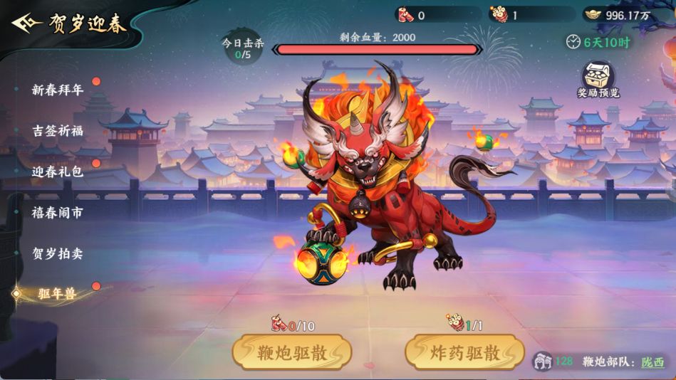 2)鞭炮部队随机出现在世界城战地图中的某一座城池中,击杀获取鞭炮/炸药(与文书部队、运马部队同理);炸药还可消耗元宝购买,可对年兽造成大量伤害。