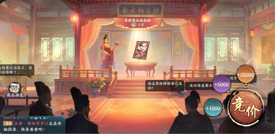 1)每场拍卖会随机上架10件珍稀宝物,主公们使用“贺岁积分”出价竞拍,价高者得;