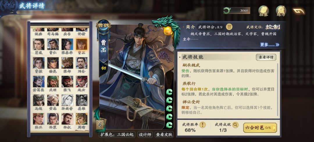 综上:旧曹丕是一个全能的武将,有输出(中毒),有控场(拆2),有卖血(拿伤害牌且反馈)。除了过新牌能力约等于摸牌白没有弱点,而且每一个技能的效用都堪比别人的主技能。遇事不决曹丕,这是抢占生态位的体现,故应下调收益或创造弱点,使另一些武将有出场空间。