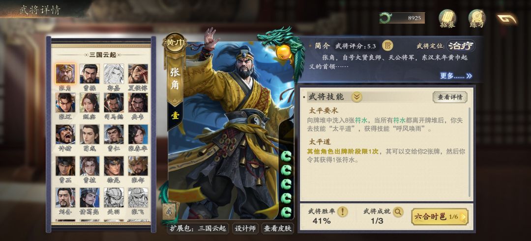 综上,张角应该是一个轻配合/轻对策高过牌武将,可以放在嘲讽略高的身份位置上的武将。我认为在较早的环境中,他的收益是足够的。只是随着逐渐泛滥的伤害属性,张角对牌局的掌控力相对有下滑。
