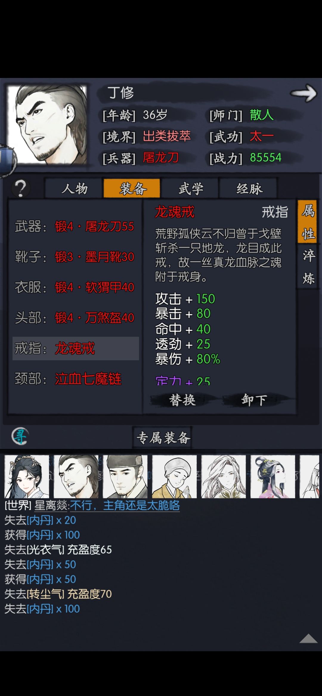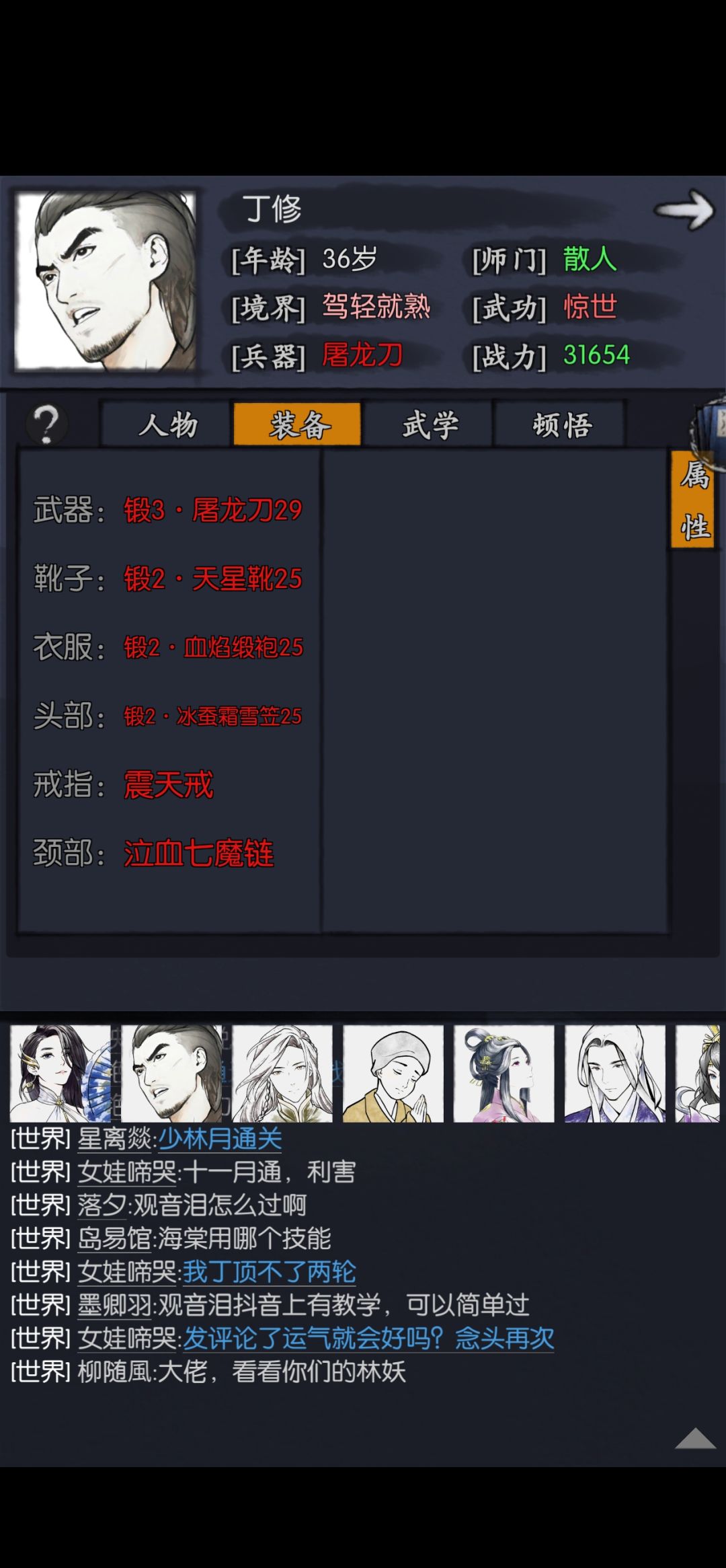 今天是丁修最后一天,凹了一下历练,凹到了白龙。实在凹不动了。贴一下装备和属性p3,4。丁修逃课实在好用。但是相对的,会在通天里卡50和54这类需要爆发输出的关卡,有舍有得。