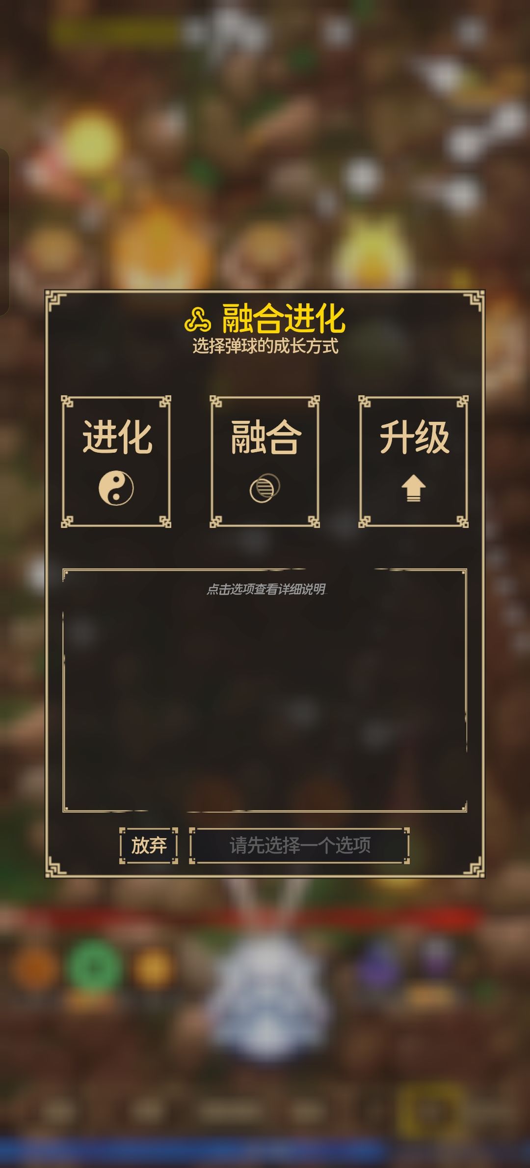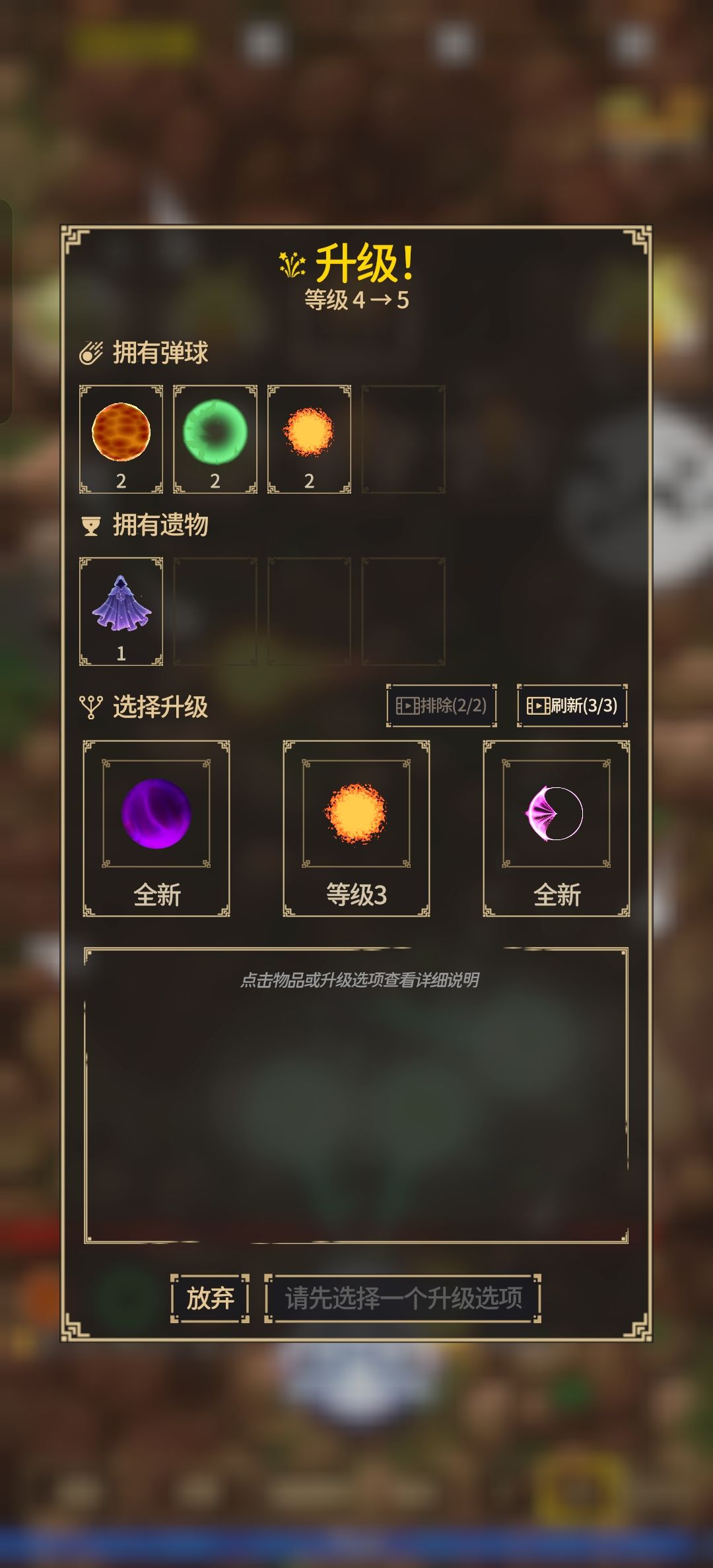 打怪掉经验,最下面蓝色的是经验,经验够可以进行选择,从3个选项里进行选择,新手有4个弹球栏位,4个遗物栏位,满了之后不会出新的了,已经有的会出现,选一次升一级,3级满级,栏位全满,只剩2个没升满时,会出现词条,回血加盾减速之类的