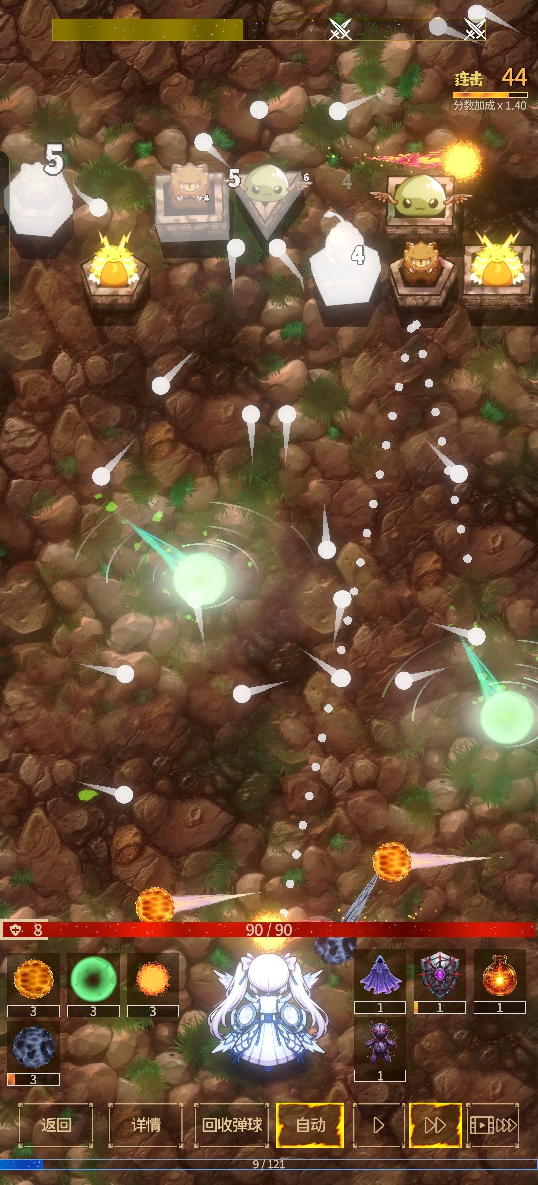 自动是自己瞄准最近的敌人下方,回收弹球是把场上所有弹球回收