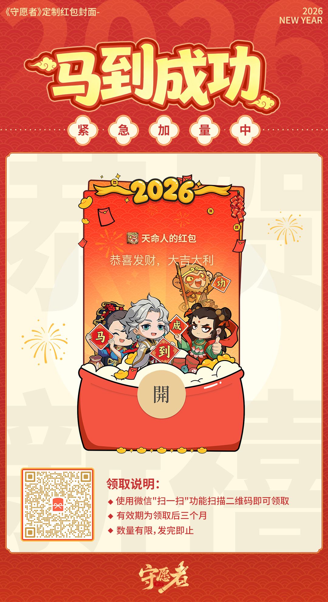 《守愿者》 新春限定红包封面,现已在正式上线啦!快动动手指领走这份限定心意,把来自三界的祝福与好运,送给你身边最重要的人吧~