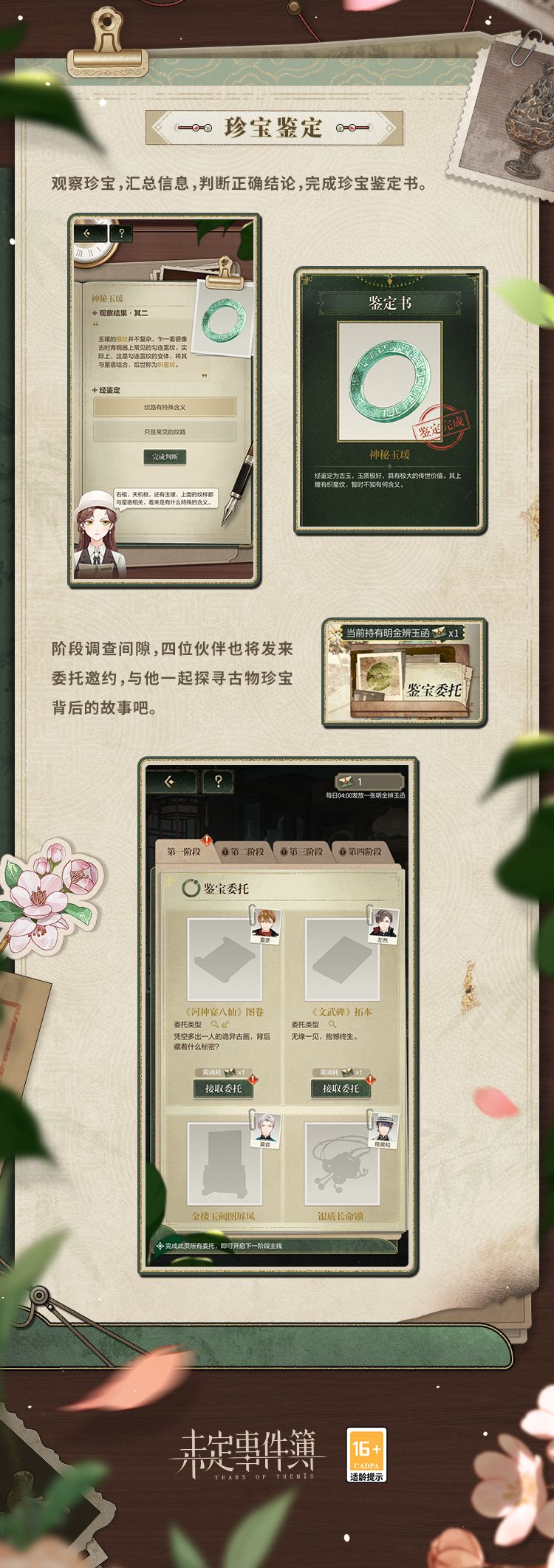 未名城近日接连发生与珍宝相关的反常事件,暗流汇涌之下,潜藏着阴谋与危机。为解疑云谜团,鉴宝师将与调查伙伴共同商讨对策,开展探索调查。阶段调查间隙,四位伙伴也将发来委托邀约,与他一起探寻古物珍宝背后的故事吧。