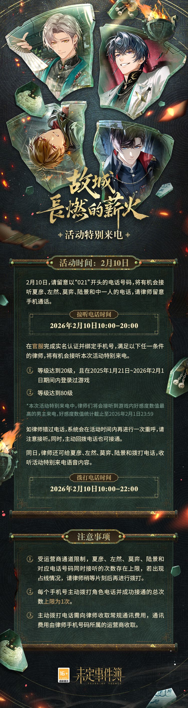 -2月10日10:00-20:00,请律师留意“021”开头的电话号码,将有机会接听夏彦、左然、莫弈、陆景和中一人的电话,电话将按照律师在游戏内的好感度拨出,请律师留意手机通话