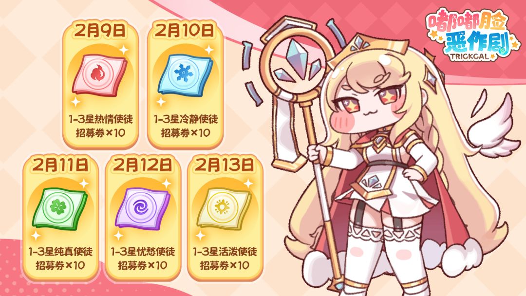在接下来2月10日~2月13日,我们还会分别赠送给您【1~3星冷静/纯真/忧郁/活泼使徒招募券】×10