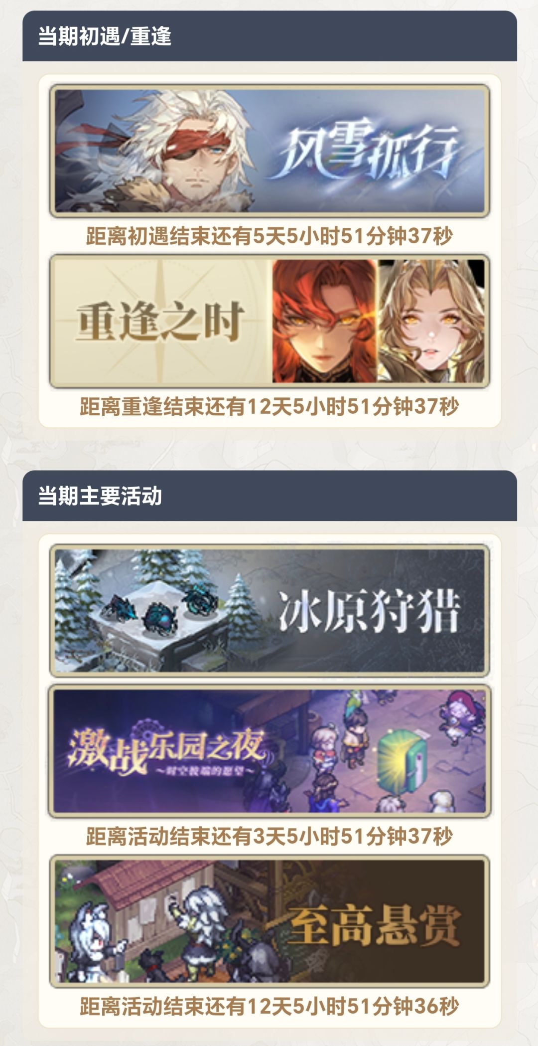 2.首页新增初遇/重逢/活动倒计时;顶部菜单栏新增“关卡”,整合高难关卡/限时活动板块。