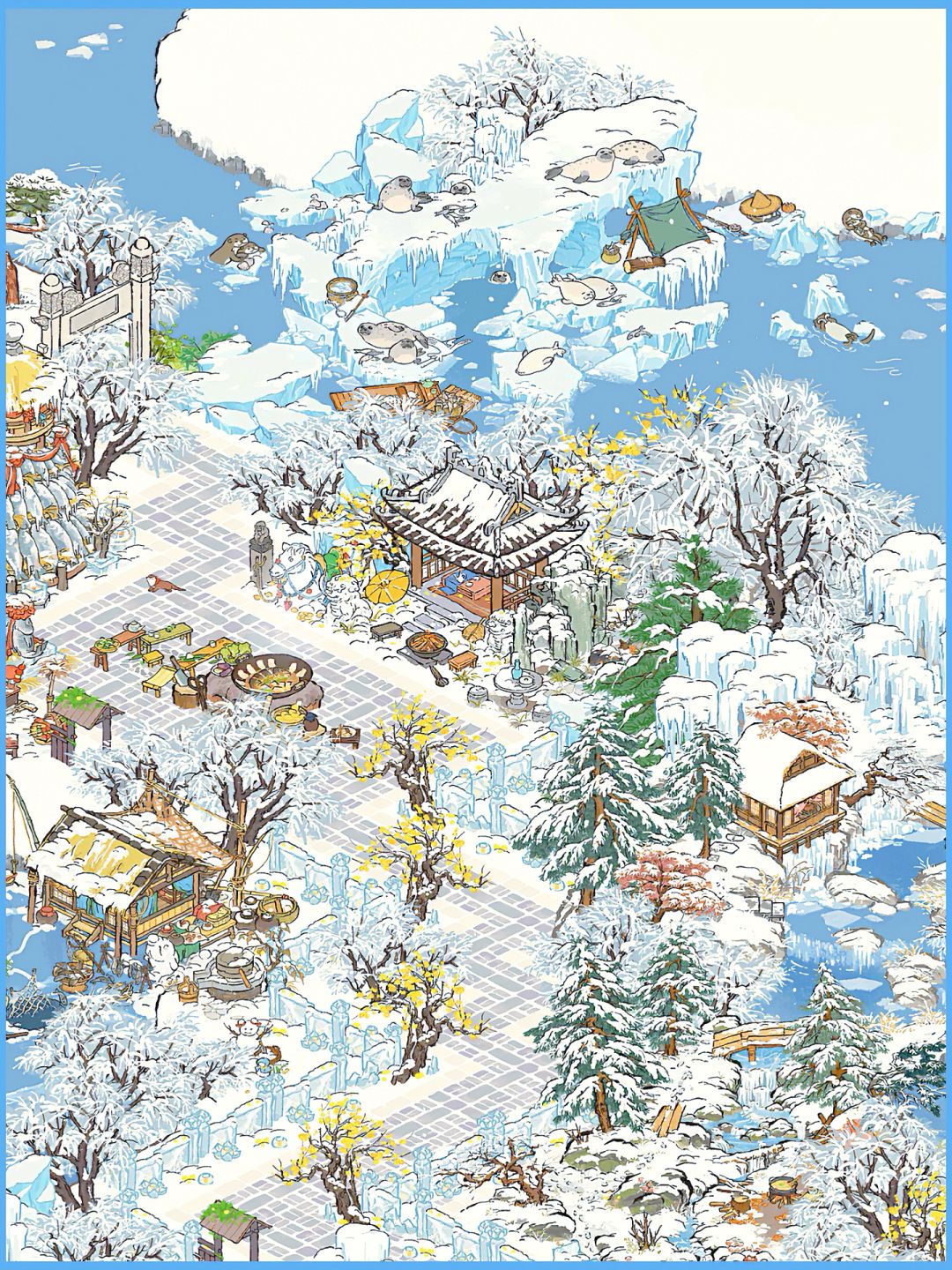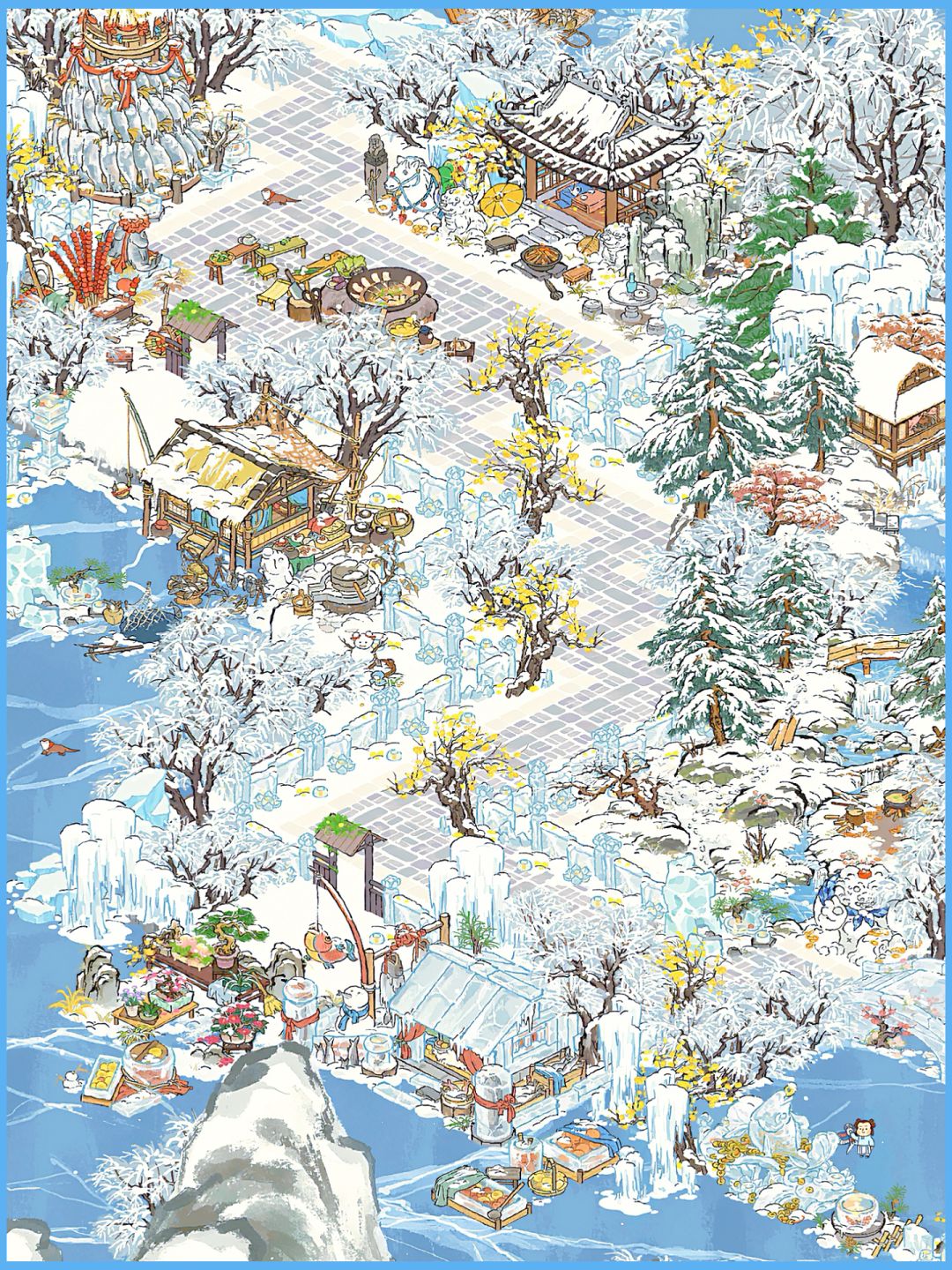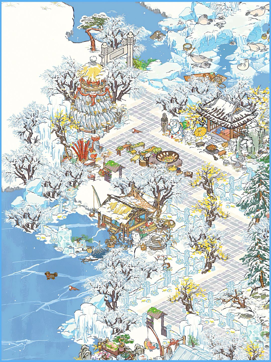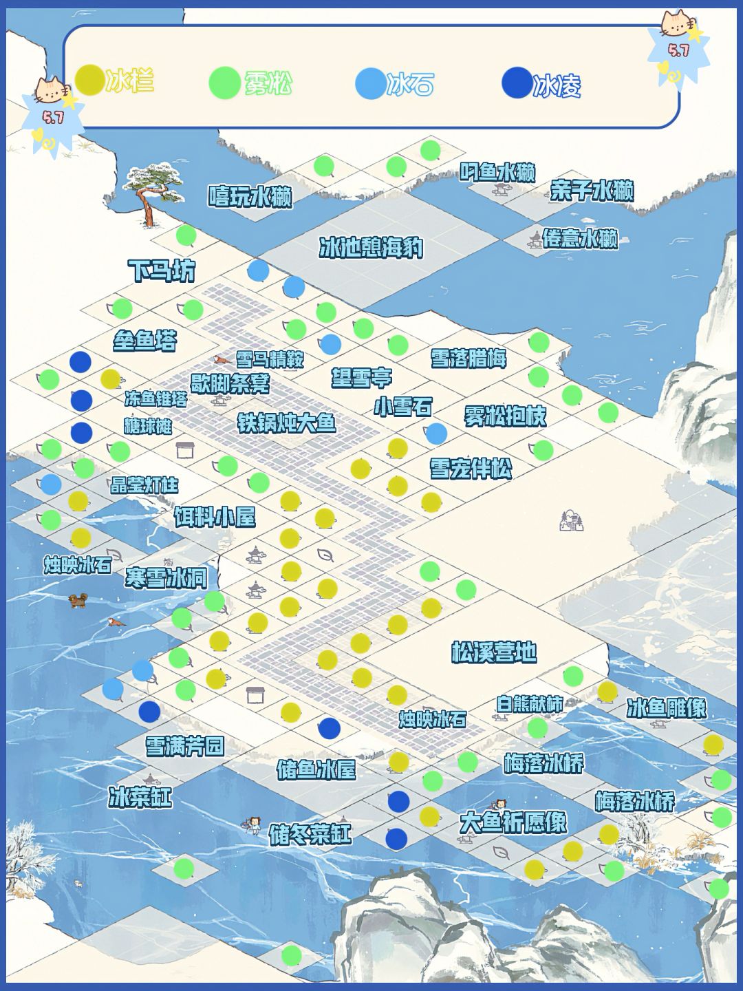 建筑:松溪营地、储鱼冰屋、雾凇抱枝、雪宠伴松、望雪亭、垒鱼塔、寒雪冰洞、饵料小屋、铁锅炖大鱼、雪满芳园、糖球摊、冰菜缸、储冬菜缸、梅落冰桥、