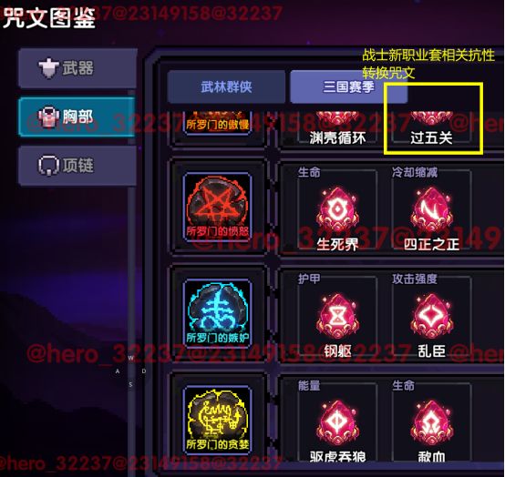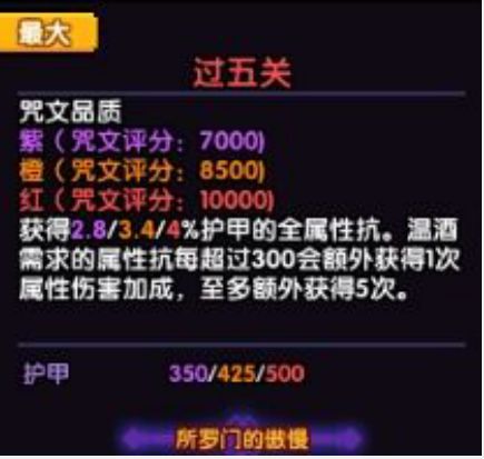 可以看到,过五关效果和暗金上的温酒是联动的,同样很有职业特色,护甲转换为抗性,所以这也是我前面说高练度玩家不需要在暗金上打抗性即可达标新职业套2100抗性。