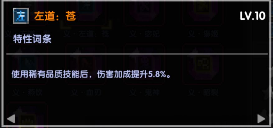左道:苍:用个稀有技能就触发,相当不错,需要的稀有品质技能是蓝色的,需要特性再带一条朱雀来触发。