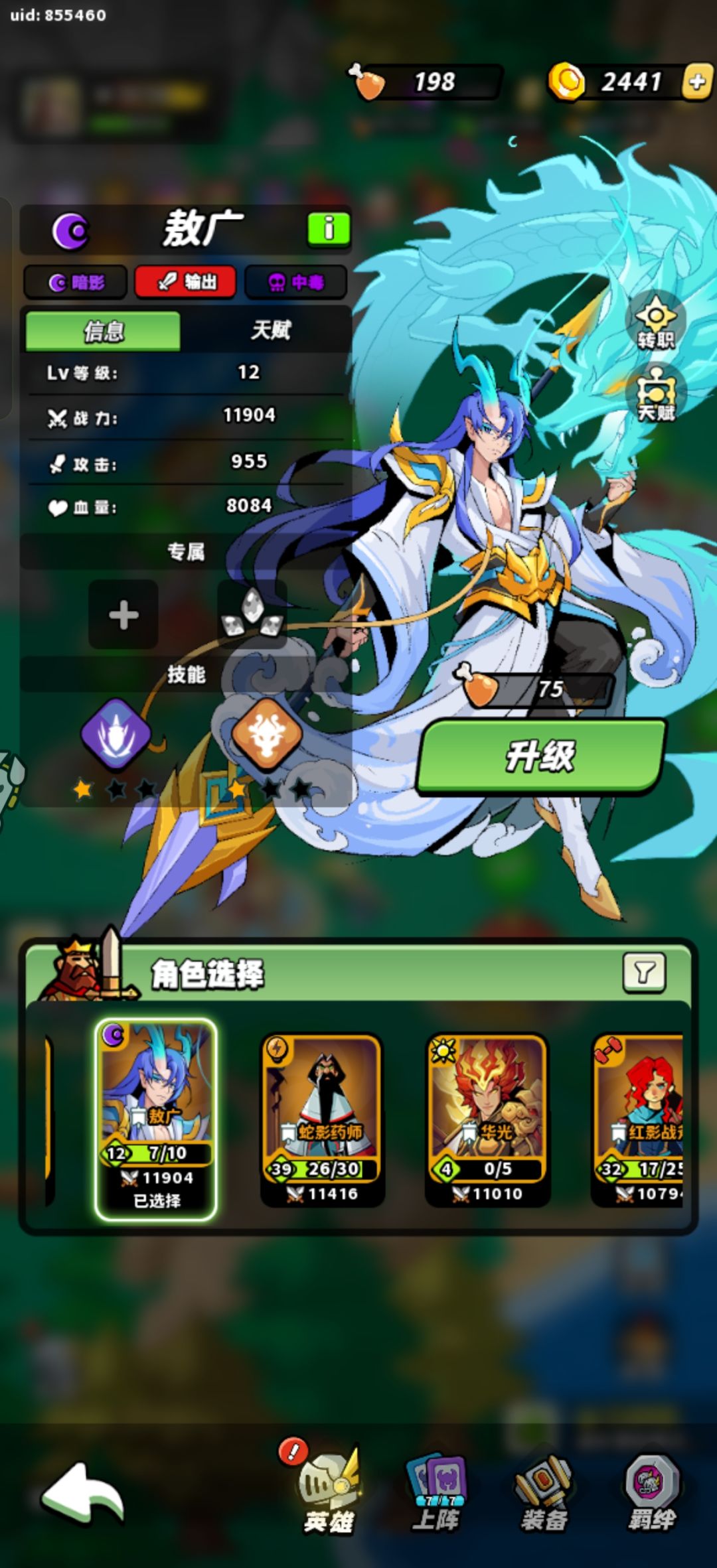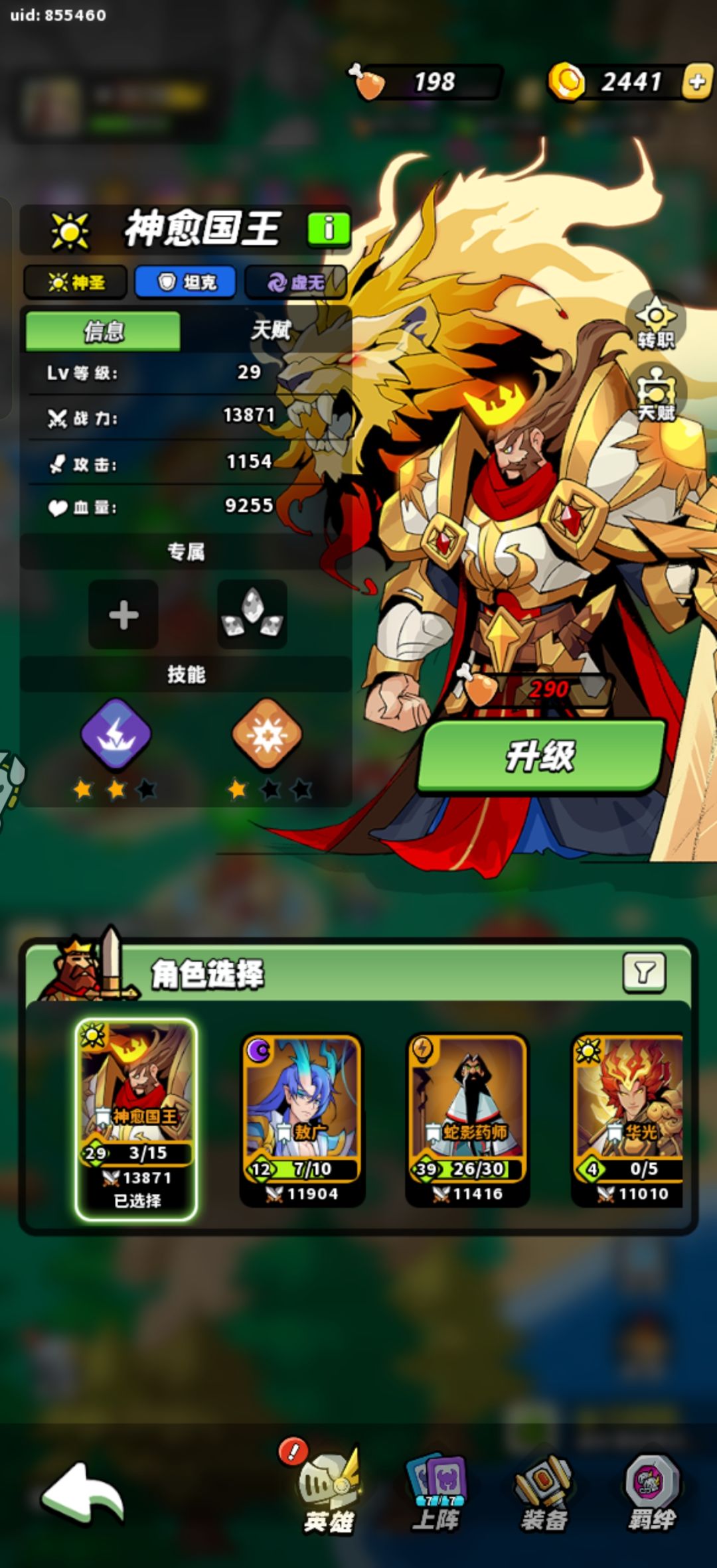 推荐几个自己用着舒服的英雄,主走毒,主培养国王,能打伤害,有治疗,还能抗,蛇药师很强,在配合几个放毒的,伤害不错,治疗先用精灵少女,后面乐章多了可以一起上,光暗都强,1级属性也堪比20级的其他