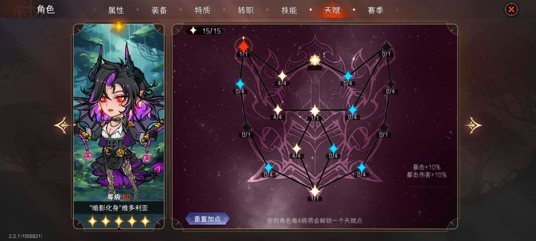 6. 天赋。角色完成转职后,可花费金币和蓝星解锁天赋点,60级满级时,一共有15点,解锁后的天赋点不随更换职业消失。