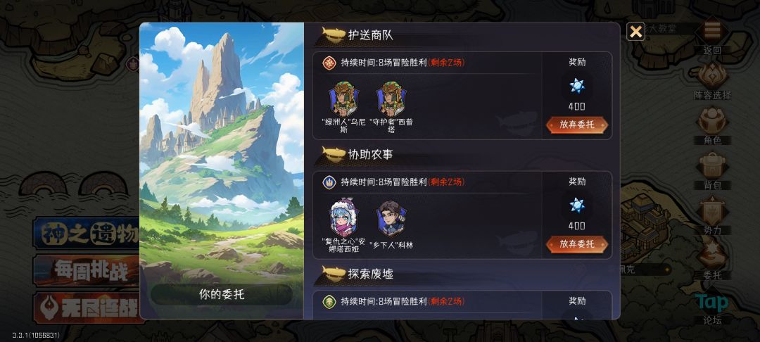 目前最多只能同时进行四个委托任务,一般选择蓝星×3+紫星(紫星够用后换成金锭)的材料。两个角色星级加起来八星可额外获得约一倍奖励。