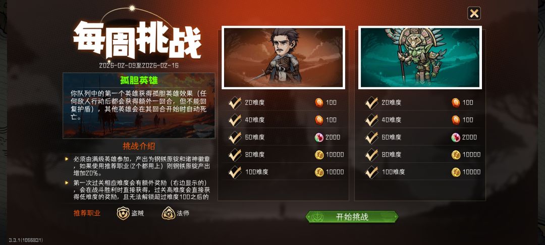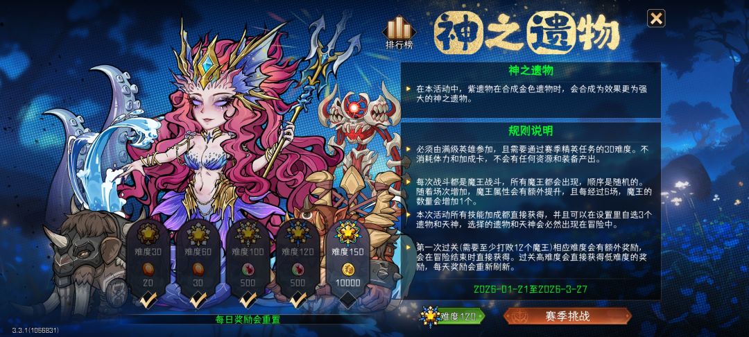 奖励每日刷新,是稳定获得钻石、皮肤币的地方。共分30、60、100、120、150五个难度。