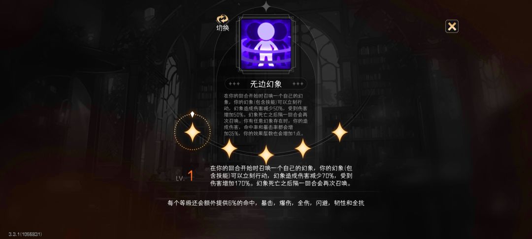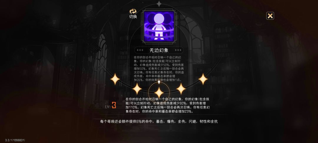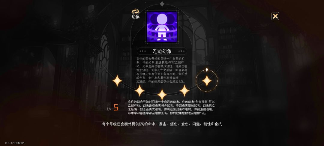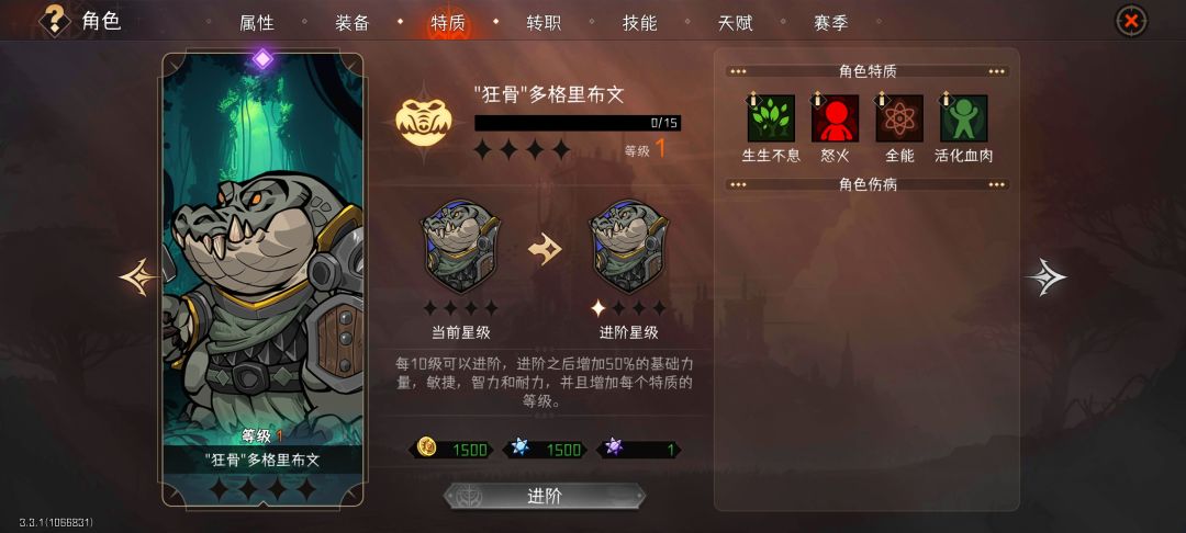 4. 特质。分为金角色专属特质和通用特质两种。金色、紫色角色拥有4个通用特质,蓝色3个、绿色2个、白色1个。