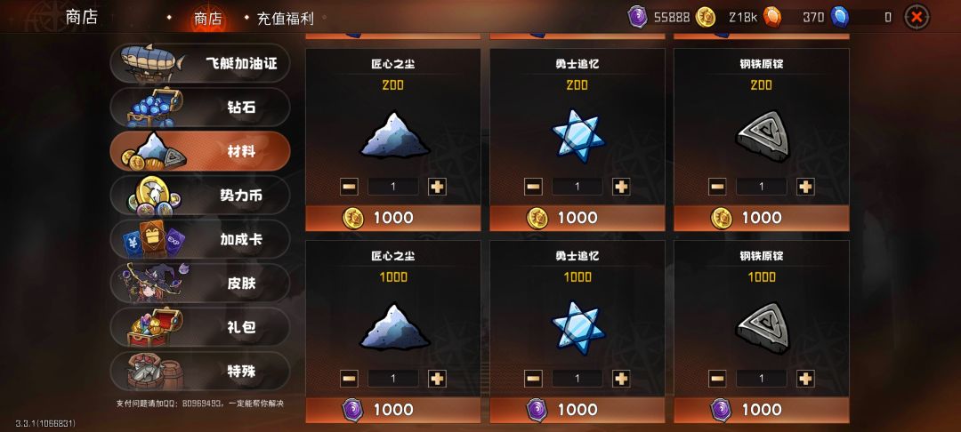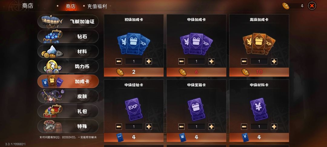 商店的功能很多。充值、月卡、礼包、皮肤等是网络游戏生存的必备条件,加成卡、材料和特殊等是日常用到的功能,可以通过金币、旋涡币等兑换其他资源,加快养成。