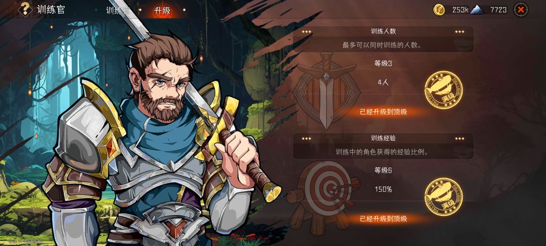 2. 训练官。当获得其他角色后,若练度不足时无法上阵时,可放在训练官里,当消耗体力和加成卡通关副本时,会获得一定加成经验(经验加成随训练官等级提升而提升,最高加成150%,插金卡和面包打4把就60级了。)