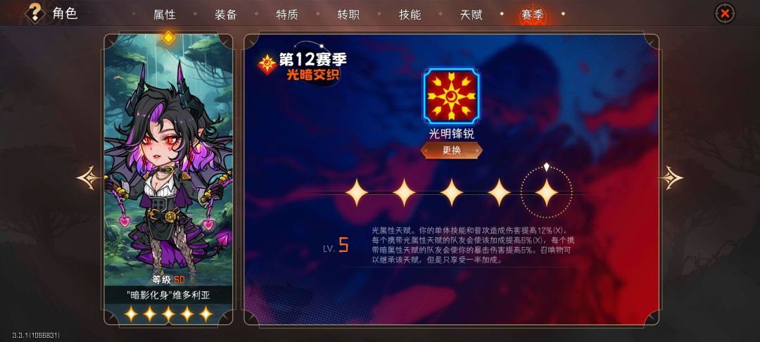 7. 赛季天赋。60满级后的角色专属。每个赛季的赛季天赋不同,花费赛季币解锁和升级,更换天赋无须重新升级,请按需选择。