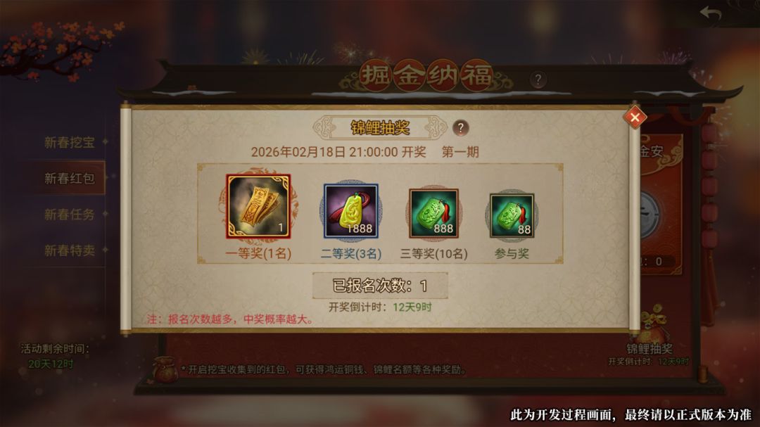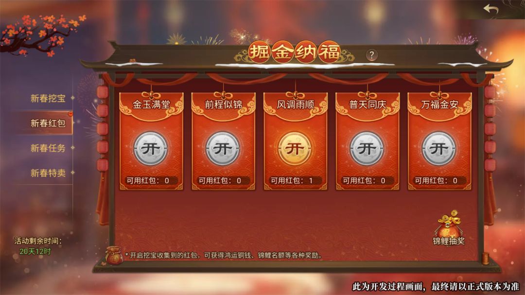 以上五种红包中,开启任意新春红包即视为参与本次锦鲤抽奖,有机会获得 黄天封神符、1888黄玉、888玉符 等幸运大奖!