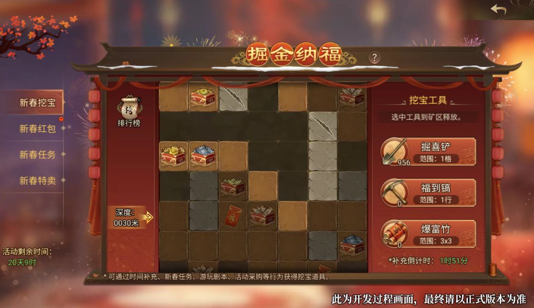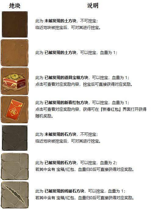 活动期间,主公们可通过 选中挖宝道具 掘喜铲、福到镐、爆富竹 后,点击左侧矿区地块进行挖宝,获得 道具宝箱、新春红包 奖励。