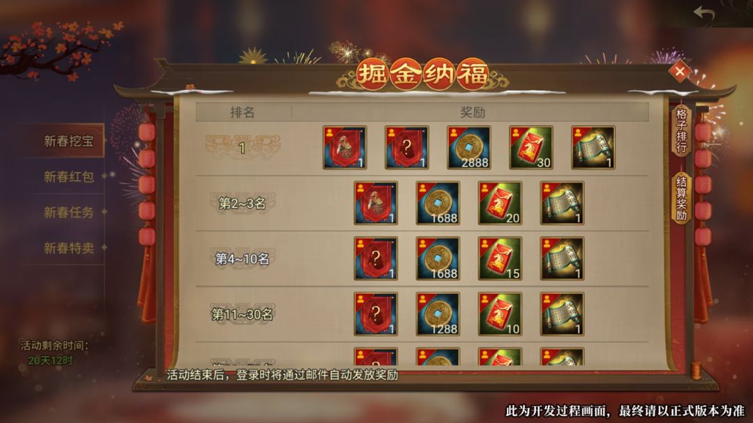 -『掘金纳福』、玄甲战旗-自选、大泉铜钱 等丰厚奖励。