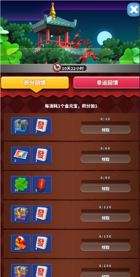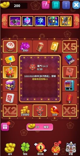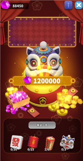 3.通过收集[麻将]、[灯笼]、[炮仗]、[醒狮]这四种彩金道具来获得参与彩金的抽奖。可在转盘中直接抽到,或抽中事件格时有几率额外获得。麻将:单独使用立即从彩金池获得600-2400的宝石。灯笼:单独使用立即从彩金池获得1200-4800的宝石。炮仗:单独使用立即从彩金池获得2400-9600的宝石。醒狮:单独使用立即从彩金池获得3000-12000的宝石。
