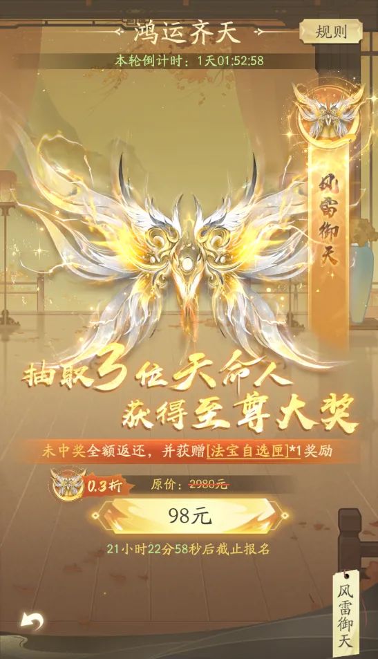 每轮活动会从参与玩家中抽出【数名超级幸运儿】送出大奖,未中奖的玩家会以【代币】形式返还消耗,并且附赠【鸿运馈赠】!