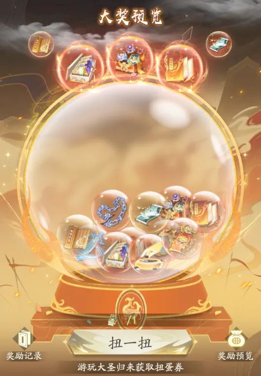 参与大圣归来的活动时除了能获得道具外,还能获得大圣扭蛋卷,可在扭蛋中获得丰厚奖励,有机会获得秘传自选宝匣~!
